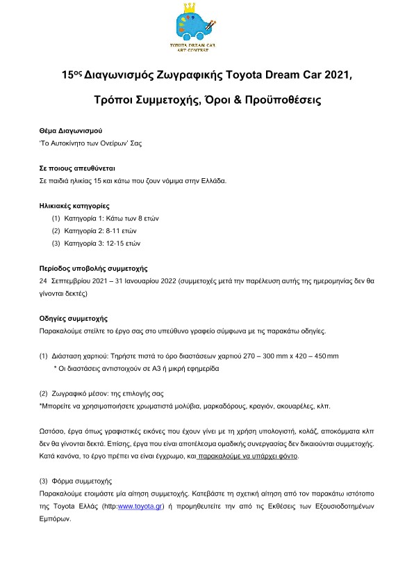 Η Toyota συνεχίζει για 15η χρονιά το ταξίδι της μέχρι την Ιαπωνία, με έναν απλό και μαγικό διαγωνισμό για τους μικρούς της φίλους. H αποστολή σας είναι απλή. Οδηγήστε το δημιουργικό σας πνεύμα σε ένα φανταστικό ταξίδι, χρησιμοποιώντας μόνο τη φαντασία σας και ζωγραφίστε το αυτοκίνητο των ονείρων σας!
